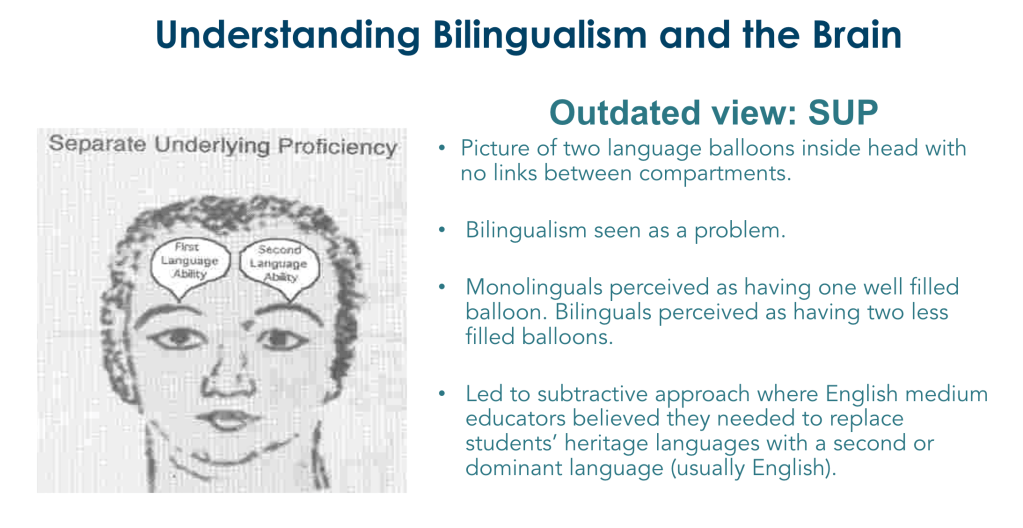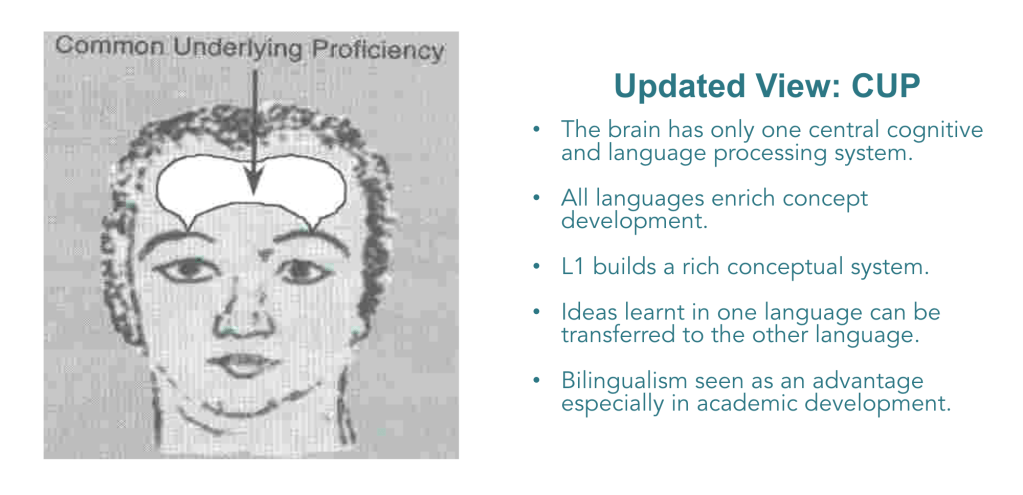 We now recognise that there is interdependence across the language resources. Leaner’s can transfer their ideas from one language to another via the brain’s central cognitive and language processing system, also known as Common Underlying Proficiency (CUP). Irrespective of the language in which a person is operating, there is one integrated source of thought (Baker & Write, 2017). Therefore, limiting the thinking to prior knowledge encoded in English learning only is to only tap into a very small portion of the learner’s prior knowledge.