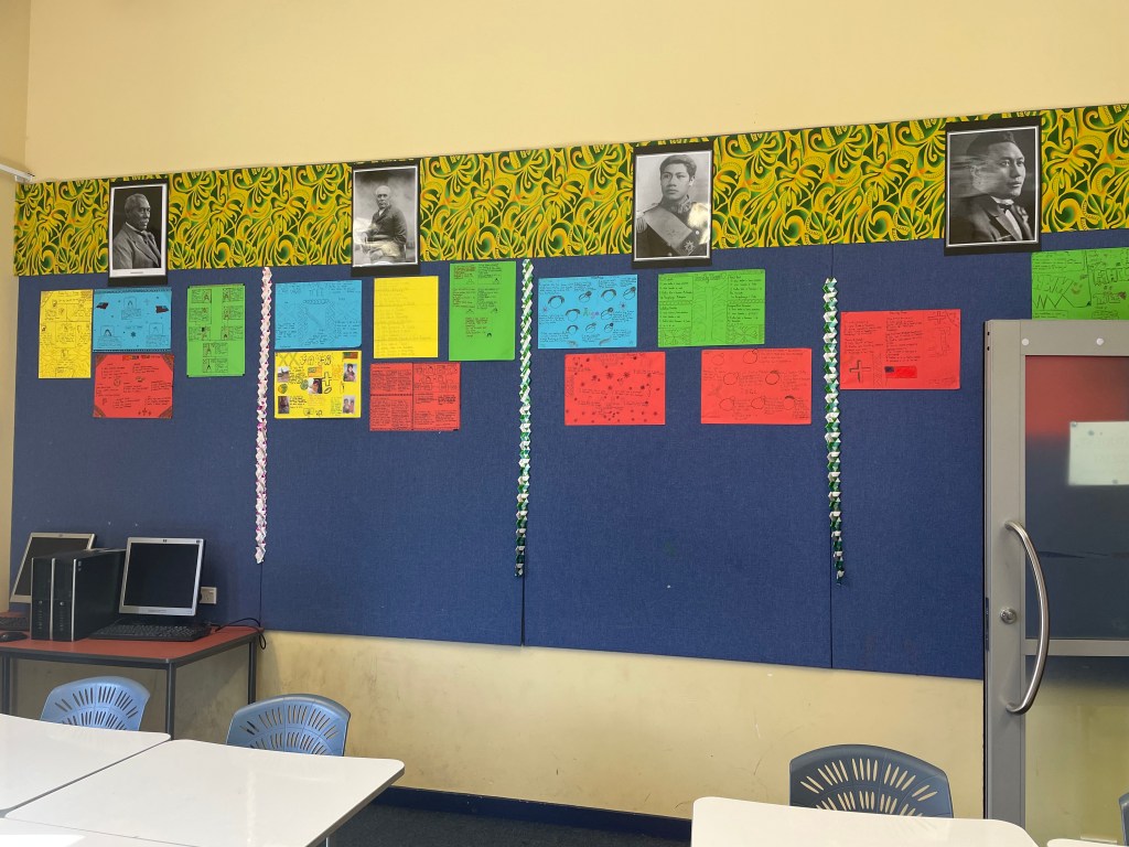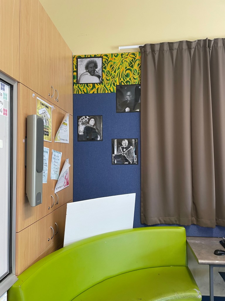 I was really drawn to the images of the Māori, Samoan, and Tongan royalty. He explains that he added the Māori kings and queen on his wall to give credence to the tangata whenua, and the mana whenua of the area upon which the school sits. He got me thinking about my own display of the Kāhui Ariki.