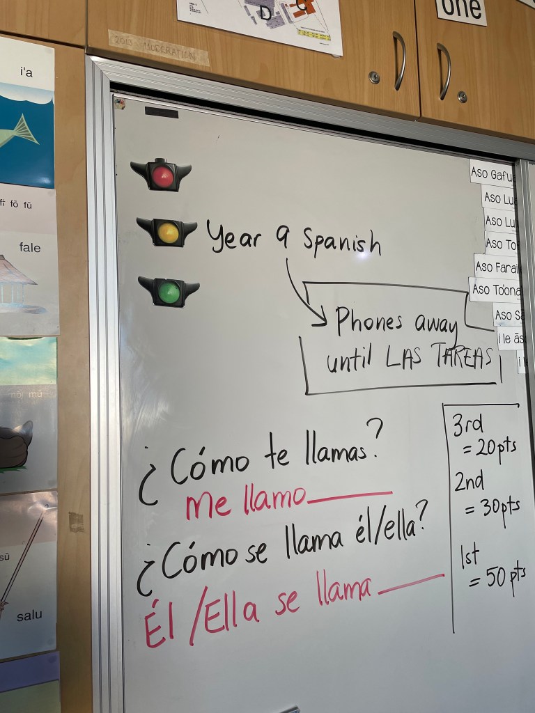 While Spanish and English are the languages of instruction, fa’a Samoa is what manages and runs in her Year 9 Spanish class. Mrs. Sime is an adept border-crosser. She is firmly rooted in her own ancestral language and culture which has allowed her to traverse into other cultural and linguistic domains with ease and confidence while still maintaining her own. She switches between three languages through the lesson, English, Spanish, and Sāmoan. She gives a telling-off to the excitable corner of ākonga in Sāmoan before she goes back to instructing the class in English and modelling sentences in Spanish. It was so cool to hear and watch.