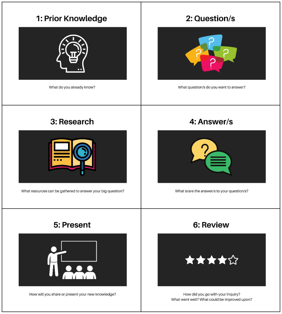 - Research – what resources can be gathered to answer your question/s? What resources are needed to answer your question/s? What strategies can we use to gather the information?